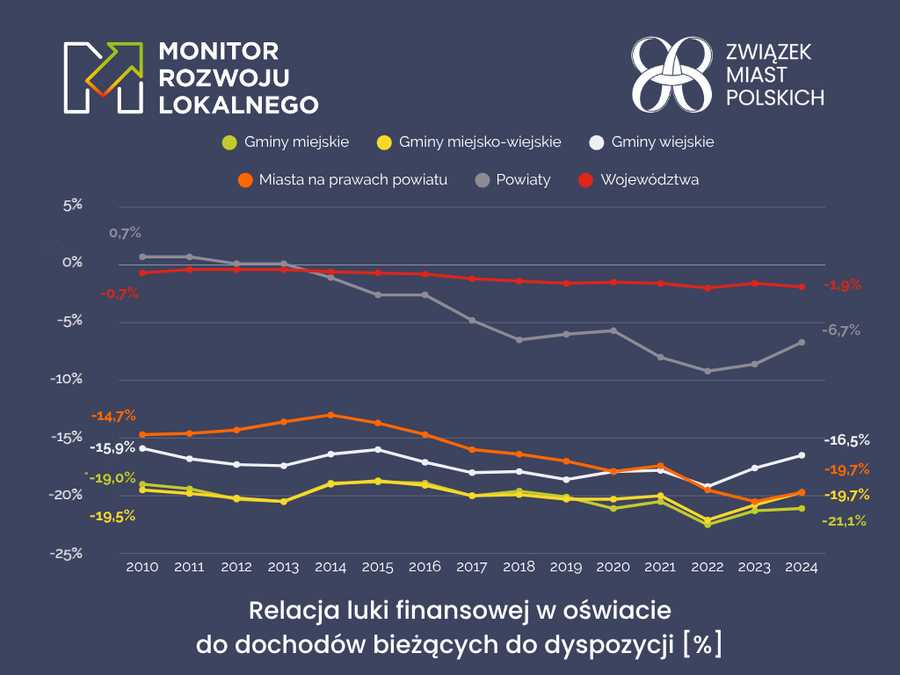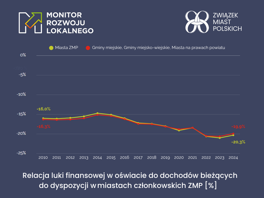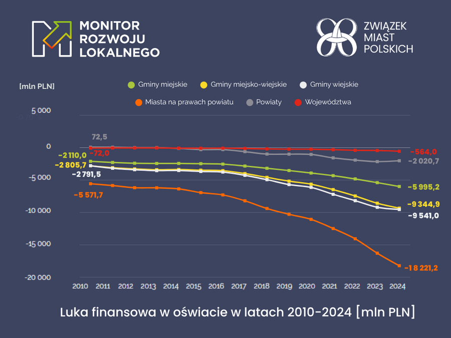 Łączna wartość luki finansowej w oświacie we wszystkich JST na koniec 2024 r. wyniosła blisko 45,7 mld zł, przy 13,3 mld zł w 2010 r. Począwszy od 2017 r., istotnie przyspieszyło tempo pogłębiania się luki finansowej w oświacie, na skutek przeprowadzonej w 2016 r. reformy systemu oświaty. W samych miastach (gminach miejskich, miejsko-wiejskich i miastach na prawach powiatu) luka finansowa w oświacie na koniec 2024 r. wyniosła 33,6 mld zł, z tego ponad 26,2 mld zł dotyczyło naszych miast członkowskich. Zarząd Związku Miast Polskich już 26 sierpnia 2016 r. zwracał uwagę na wzrost kosztów jednostkowych, będących następstwem proponowanej wówczas reformy oświaty i wygaszania gimnazjów. Przewidywania te sprawdziły się, bowiem średnia dynamika luki finansowej w oświacie w latach 2017-2024 wynosiła ponad 112%, podczas gdy wcześniej, w latach 2010-2016, kształtowała się na poziomie niespełna 105%. W kontekście pogarszającej się sytuacji finansowej podsektora samorządowego i rosnących kosztów świadczenia usług publicznych, obszar związany z finansowaniem oświaty jest jednym z najpilniejszych do gruntownej zmiany.