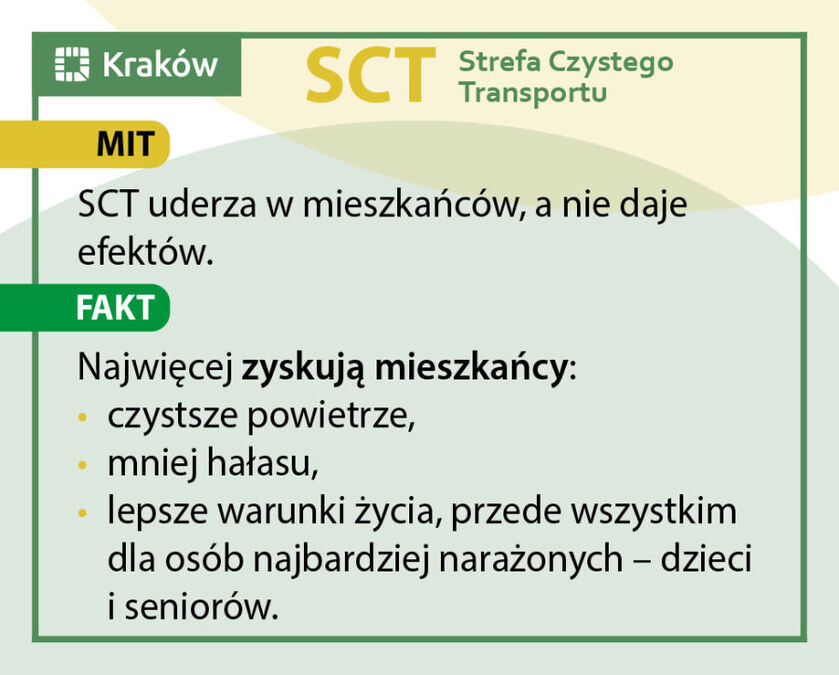 To także odpowiedź na oczekiwania mieszkańców, którzy w badaniach wskazywali, że wciąż martwią się stanem powietrza, którym oddychają, hałasem generowanym przez samochody i brakiem miejsc parkingowych w centrum. Władze Krakowa nie lekceważą tych problemów, chcą skutecznie je ograniczyć, m.in. właśnie dzięki wprowadzeniu SCT.