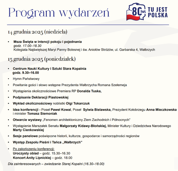 Wydarzenie zacznie się od mszy w intencji pokoju i pojednania w Kolegiacie na ul. Garbarskiej. Następnie uczestnicy przeniosą się do Zamku Książ – jednego z najważniejszych symboli regionu. Po uroczystej kolacji na ekranie wyświetlony zostanie film „Sami swoi” mówiący o przesiedleniach, nowych początkach i odnajdywaniu swojego miejsca.