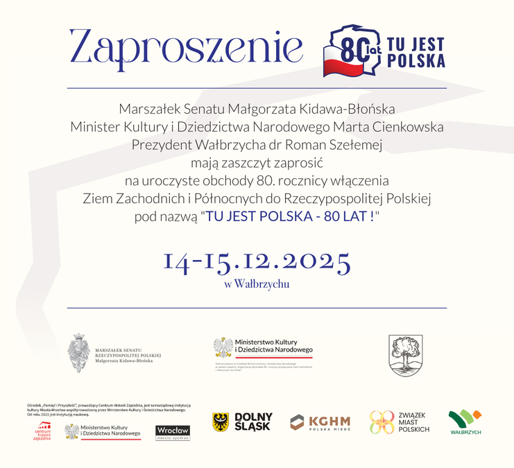 Na uroczystości zaprasza Marszałek Senatu Małgorzata Kidawa-Błońska, Minister Kultury i Dziedzictwa Narodowego Marta Cienkowska i Prezydent Wałbrzycha dr Roman Szełemej.